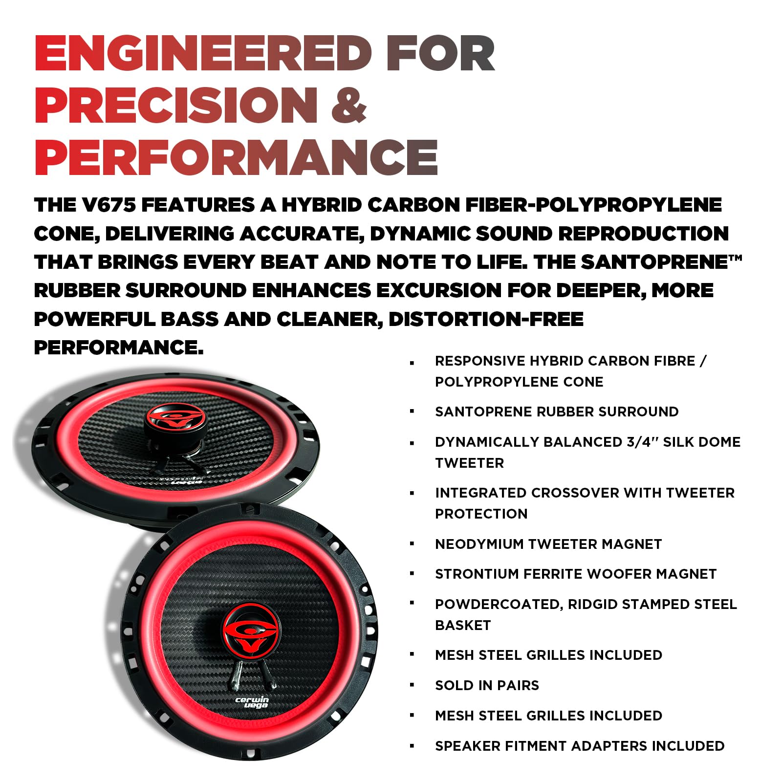 Built with reinforced cones, sturdy surrounds, and a solid frame, the V675 speakers are designed to withstand daily driving conditions. Their compact, lightweight design ensures easy installation while delivering consistent, long-lasting performance over time.