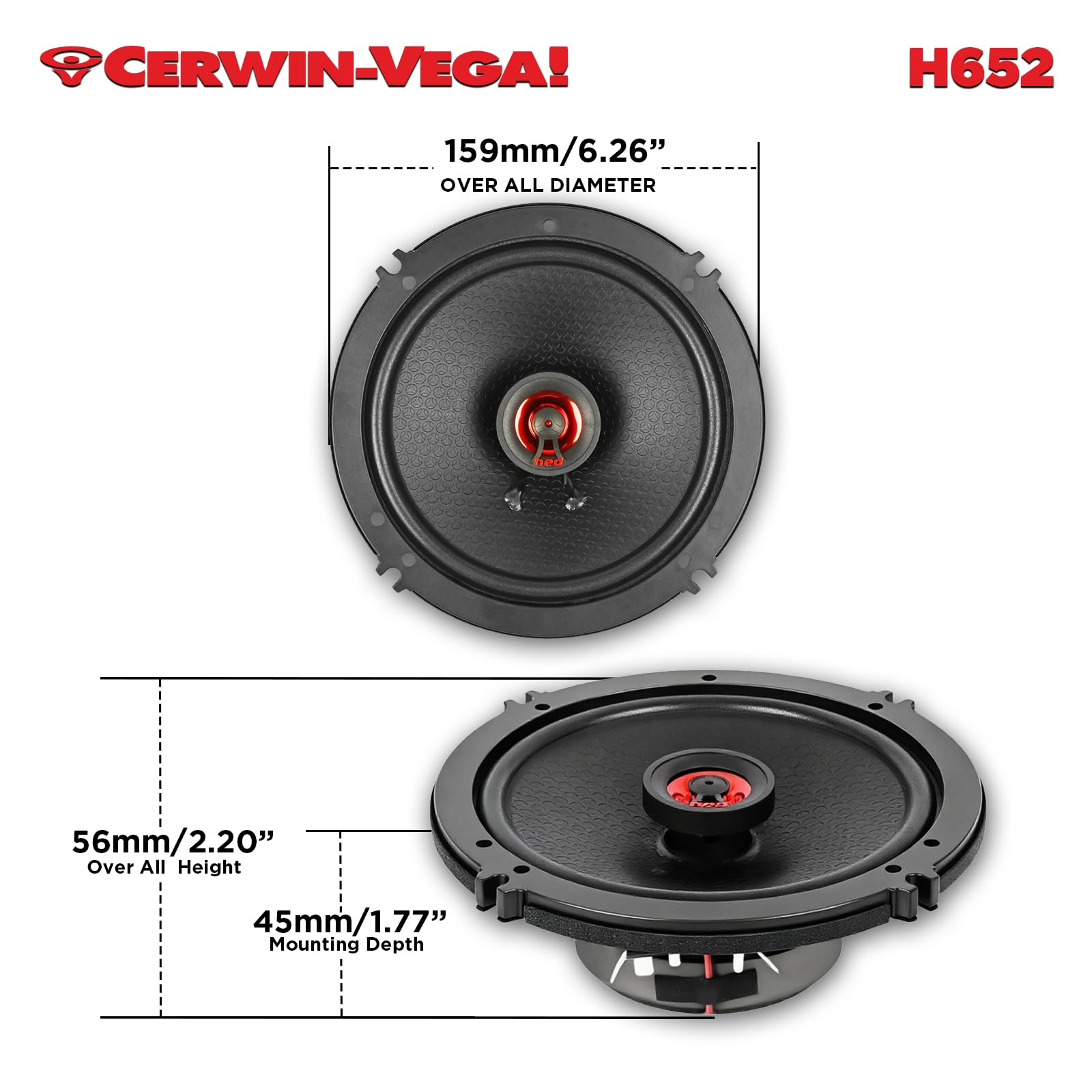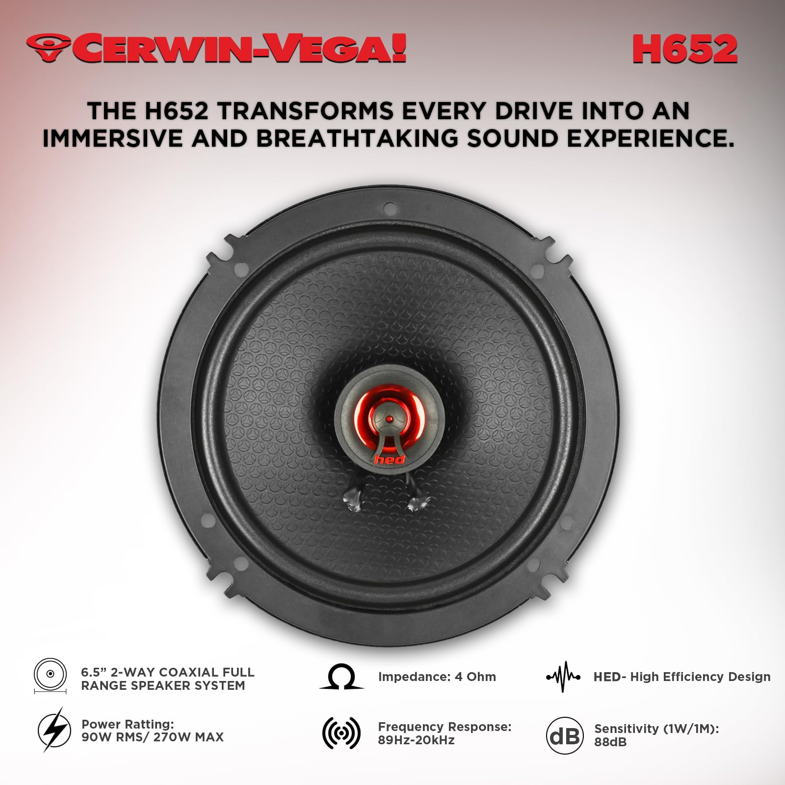 Built with Cerwin Vega’s HED technology, the H652 features a reinforced multi-layer cone and an efficient motor structure for accurate sound reproduction. The integrated tweeter enhances high-frequency detail, delivering smooth and crisp treble while maintaining clean mids. Engineered for durability and low distortion, these speakers provide consistent performance even at higher volume levels.